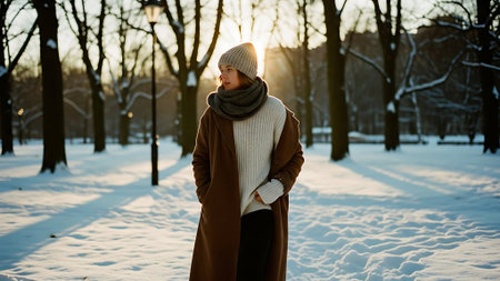 A woman enjoys a winter day surrounded by a snowy landscape. She wears a fashionable coat layered over a cozy sweater radiating warmth and joy. Bright sunlight highlights her smile.