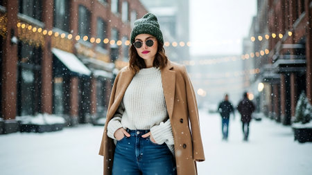 A woman standing in a snowy alley, wearing a cozy sweater, scarf, and hat, holding a mug, surrounded by festive lights