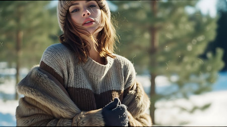 A woman in a winter setting wearing a fur coat and stylish outfit, surrounded by snow-covered trees, soft sunlight in the background