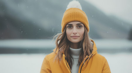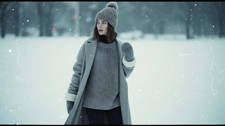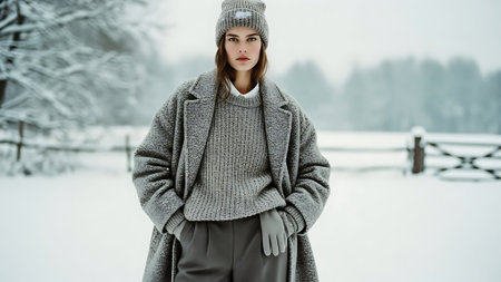 A woman in a cozy sweater standing in a snowy landscape, with soft snowflakes falling around her, exuding a serene and confident expression