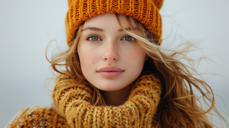 Portrait of a beautiful young woman in a white knitted hat and scarf