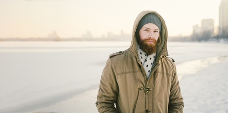 Close-up Caucasian young male red hair and beard in a hat and a park coat posing winter model against a background of a lake to freeze snow.