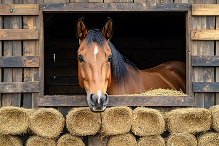Brown horse gazes through a wooden barn window, framed by neatly stacked hay bales. the rustic wooden structure adds a rural charm, the serene and natural setting of country life. Generative AI