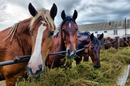 Portrait of a chestnut horse eating straw in the herd on a sunny winter day. Close-up of horse eating straw in the paddock