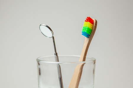 Toothbrush bamboo colored and dental tools mirror in glass. Dental care and visit to dentist