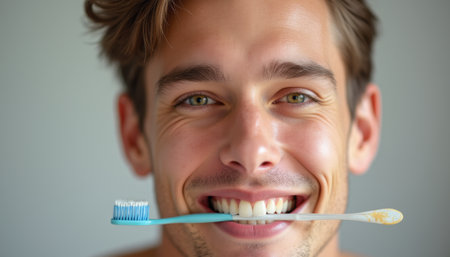 A cheerful young man with bright green eyes and a charming smile playfully holds a toothbrush between his teeth, radiating positivity. This lively image captures the essence of dental hygiene and self-care, inviting viewers to embrace their daily routines with joy and enthusiasm.