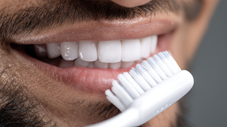 A close-up capture of a man brushing his teeth with a toothbrush, highlighting the importance of dental hygiene and personal care in everyday life.
