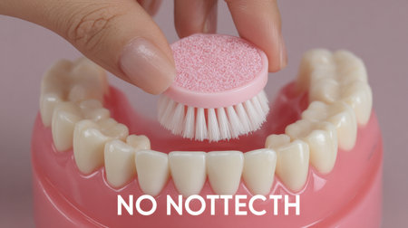 A hand demonstrates the use of a pink cleaning tool on a dental model, emphasizing the importance of oral hygiene and proper brushing techniques for healthy teeth.