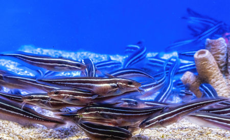 A school of Striped eel catfish, Plotosus lineatus, feeds on planktonic organisms on the sandy seafloor, This species has venomous spines that are used for defensive purposes.