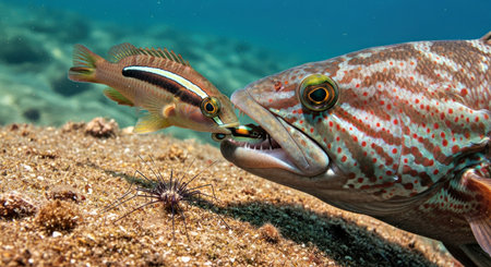 Small Cleaner Wrasse Interacting Large Fish Cleaning Station Symbiotic Behavior