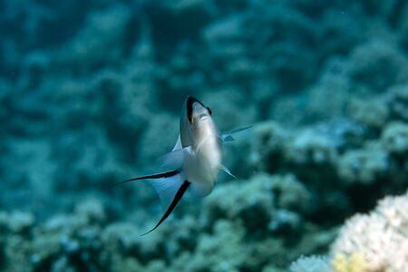 The tropical pennant coralfish (Heniochus acuminatus) floats in the blue water