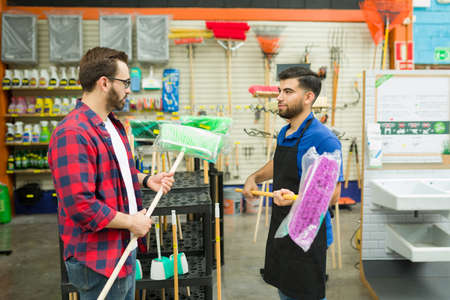 Caucasian attractive man talking with an employee at the hardware store looking to buy cleaning products and a broom