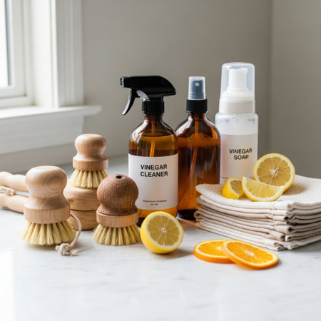 Vibrant rubber gloves and assorted cleaning supplies are arranged on a dark background, perfect for household or commercial cleaning tasks, showcasing organization and hygiene.