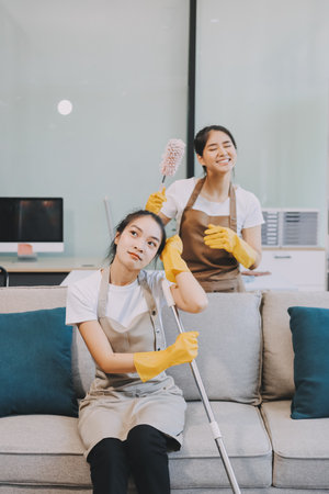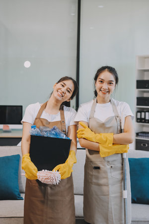 Group of young women cleaning at home. Cleaning service concept.