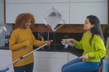 Two young women having fun while doing house cleaning. Multiracial friendship or relationship. High quality photo