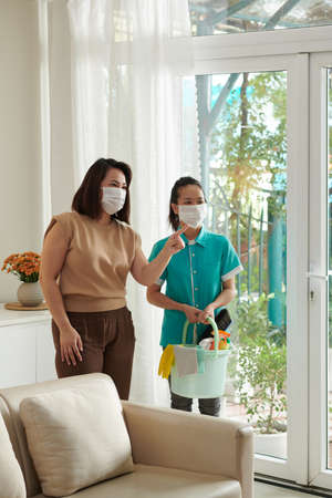 Woman in protective mask talking to cleaning service worker with bucket of tools and detergents