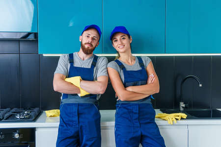 Attractive man and pretty woman in workwears posing on the camera in the contemporary cuisine with detergents