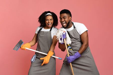 Cleaning Fun. Playful Black Couple Using Mop As Microphones, Having Fun During Tidying, Singing Together Over Pink Background, Copy Space