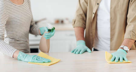 Adult couple in casual clothes, wiping with sponge in modern kitchen