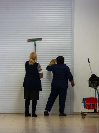 Moscow. Russia. October 4, 2020. A female cleaning service worker washes the large front windows of a building