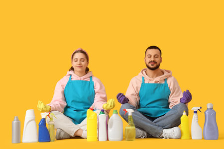 Cute young couple with cleaning supplies meditating on yellow background