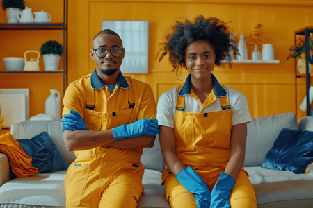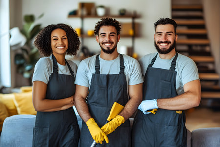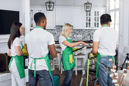 Professional mixed race janitors in uniform doing spring cleaning of modern house