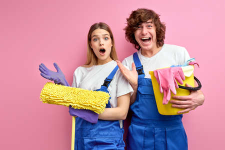 married couple in overalls and rubber gloves look at camera hold cleaning tools isolated over pink studio background, portrait of man and woman standing in shock, surprised by dirt in room