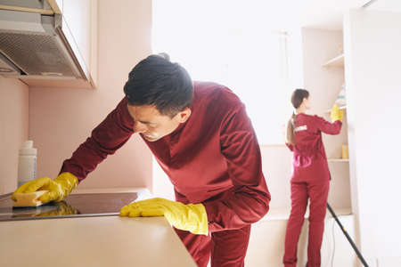 Professional janitorial staff doing cleaning in kitchen