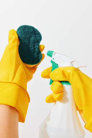 Woman in yellow gloves holding sponge and cleaning solution bottle