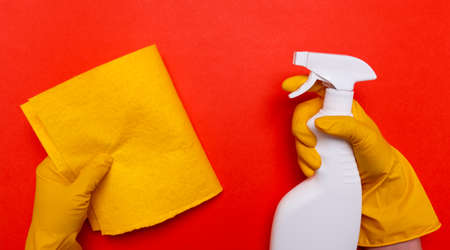 The hands of a housewife in yellow rubber protective gloves hold a bottle of household chemicals and a rag. Detergent for various surfaces in the kitchen, bathroom and other rooms. Light pastel blue background.