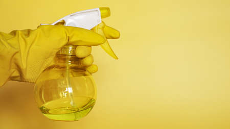Hand in yellow rubber glove holding plastic spray bottle with cleaning detergent on yellow background