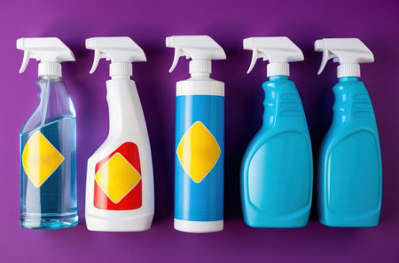 Cleaning products, plastic bottles. Household cleaning, hygiene, and sanitation concept. Isolated or grouped.