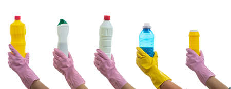 Cleaning, hand holding detergent bottles isolated against white background. Cleaner rubber glove with chemical cleaning products collage.