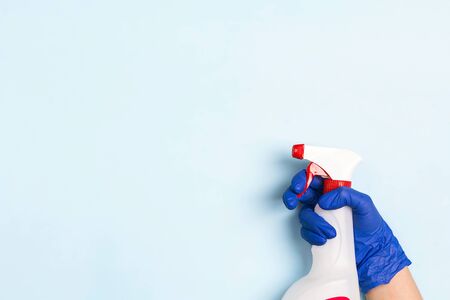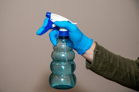 A hand in a blue latex glove holds a disinfectant. The concept of preventive protection against coronavirus. Use of antiseptics for cleaning.