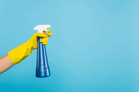 partial view of woman in yellow rubber glove holding spray bottle with detergent isolated on blue