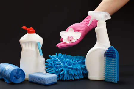 Female hands in nitrile gloves holding an orchid flower near the plastic bottles of washing liquid with a cleaning set on the black background. Washing and cleaning set.