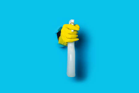 hand in a yellow glove with a sponge, next to a bottle with a spray of cleaning liquid on blue background. Coronavirus disinfection