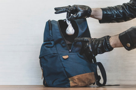 A police officer searches a drug dealer. I put the drugs in pocket. Committing a crime. Illegal drug possession. The drug courier was caught by the police.