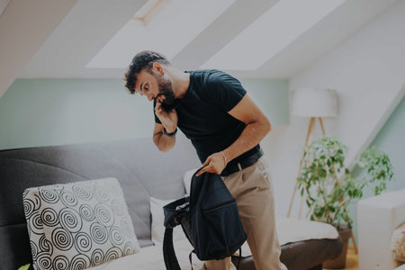 A person packs a folded blue shirt into a grey travel backpack in a sunlit room near an open door. The scene captures the excitement of preparing for a trip, vacation, or commute.