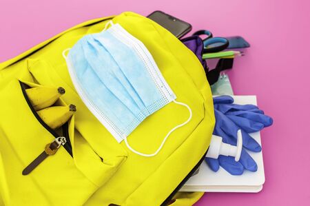 Yellow backpack full of school must-have tools also with face mask, hydro alcoholic gel and latex gloves to protect from covid-19 on the pink background