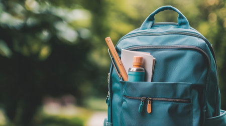A vibrant turquoise backpack containing essential items like stationery and a water bottle, showcasing a blend of style and practicality in a serene outdoor environment.