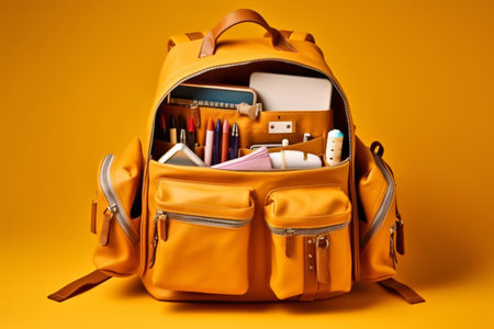 School bag. Backpack with staplers for school on yellow background. generative ai