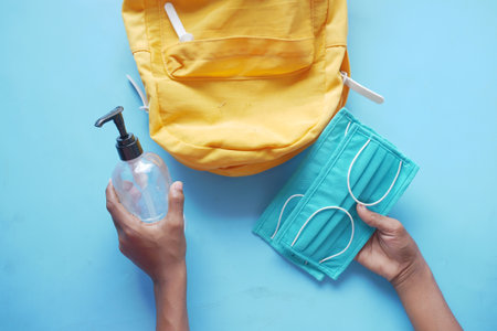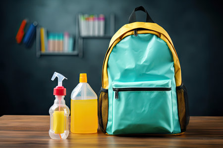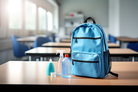 COVID 19 safety measures for school backpack mask and sanitizer on desk