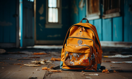 School backpack on the floor in the School hallway corridor, education day, international education day, Back to school concept.
