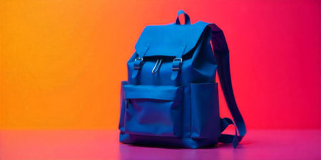 A stylish blue backpack with multiple pockets is positioned on a glossy surface. The background features a bold gradient of orange and pink, enhancing the backpack's design.