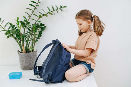 Responsible schoolgirl sitting on a table, zipping her backpack.