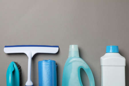 Various detergents and cleaning products agent, sponges, napkins and rubber gloves, gray background. Copy space