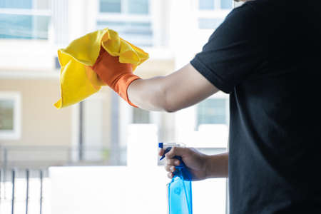 Female hand in yellow gloves cleaning window with blue rag and spray detergent. Spring cleanup, housework concept