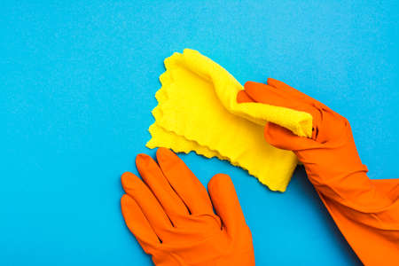 Hands in orange rubber gloves hold a yellow microfiber rag on a blue background. The concept of protecting the skin of the hands from chemicals for cleaning.