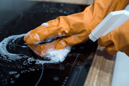 Orange glove and yellow sponge against the background of a black kitchen hob, with the cleaning agent on it. Top view. Home cleaning concept